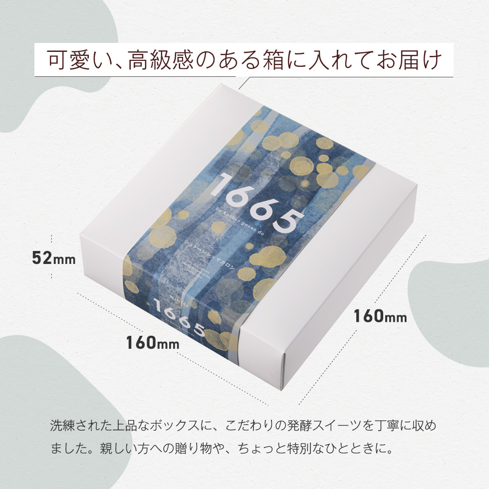 また、3色のクラシックカラーのマカロンには、甘酒バニラクリームをサンドしました。米こうじが優しく香る「1665」オリジナルのクリームは、マカロンとの相性もよく、外側はサクッと、中はしっとりした食感と一緒にお楽しみください。