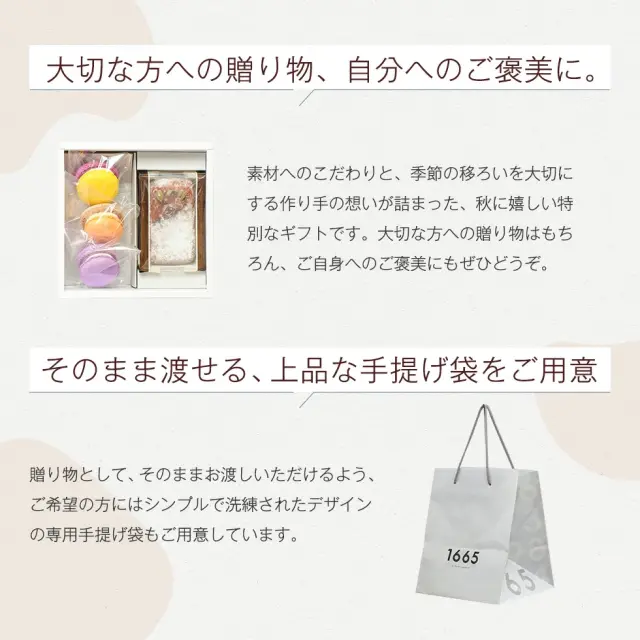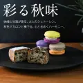 一方、セットのマカロンは、秋の装いにふさわしい優しいカラーリングで彩られています。紫芋、さつま芋、栗といった秋の味覚をイメージした色合いは、見た目にも美しく、季節感を五感で楽しませてくれます。