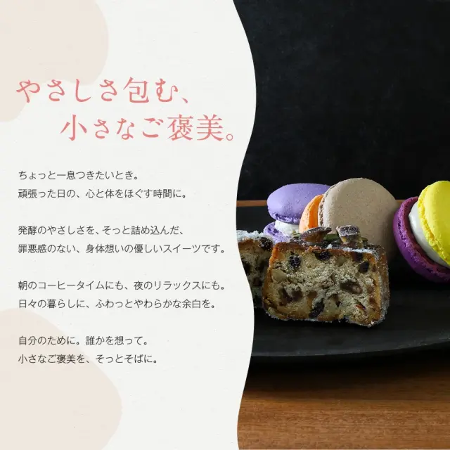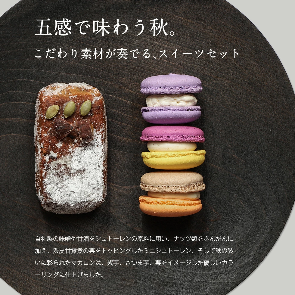 このスイーツセットは、職人が一つ一つ心を込めて作り上げた、まさにこだわりの結晶です。和の発酵素材が持つ深い味わいと、洋風スイーツの洗練された甘さが絶妙なハーモニーを奏で、この秋だけの特別な美味しさをお届けします。